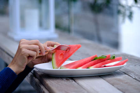 Fresh watermelon sliced in gray handmade pot on granite platform in kitchen.