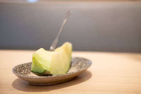 Juicy slice cantaloupe Japanese on plate. Fruits or healthcare concept. Selective focus