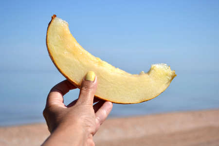 A slice of ripe melon in your hand against the background of the sea, close-up, selective focus.