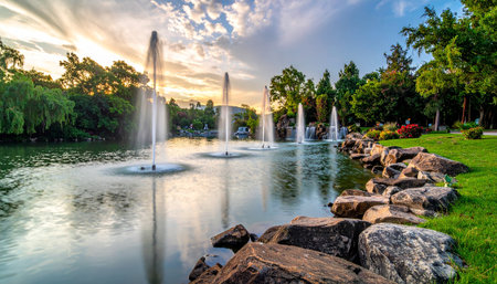 A tranquil park pond with multiple water fountains spraying water under a cloudy sunset sky with trees.