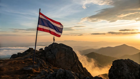 Person standing near thailand flag on rocky mountain during golden hour sky