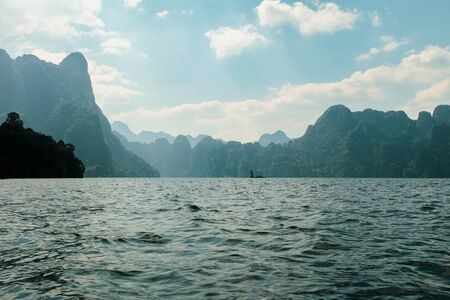 Exotic and tropical dark green and brown islands with rocks and green lake at Cheow Lan Lake, Khao Phang, Ban Ta Khun District, Thailand. Travel holiday and adventure concept.