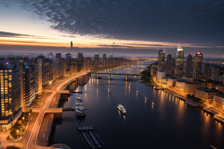 As dusk settles over the city, lights illuminate the skyline and reflect on the tranquil river below. The urban landscape exudes energy as day transitions to night.