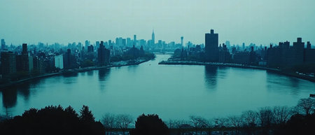 The iconic New York City skyline emerges from the deepening twilight, a testament to urban grandeur. Skyscrapers pierce the dusky sky, their lights beginning to twinkle, creating a glow. Bridges span the dark waters of the river, with faint traces of car headlights suggesting the city's ceaseless energy. The scene is characterized by cool tones and dramatic shadows, conveying a powerful and dynamic urban atmosphere.