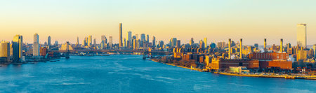 Manhattan and Williamsburg Skyline view at dawn from Hunter's Point in New York City.