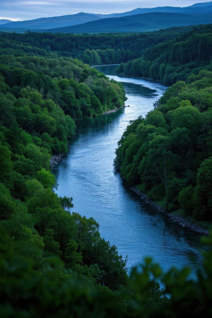 Serene mountain river flowing through evergreen forests at sunrise