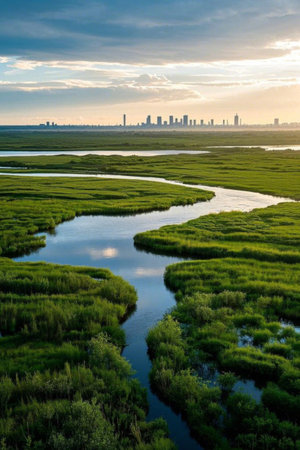 Wetland scenery and distant city skyline