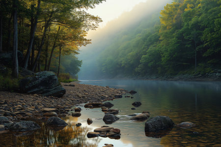 A tranquil river winds through a forest at sunrise. The water flows smoothly, reflecting the soft golden light of dawn. The right bank is covered in a multitude of rounded stones, some covered in vibrant green moss. The trees lining the forest edge display a mix of green and yellow foliage, illuminated by the gentle morning sun.