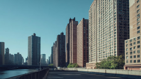 A city skyline with skyscrapers and a river