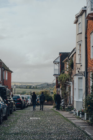 Rye, UK - October 10, 2020: People walk past old houses on Watchbell Street in Rye, one of the best-preserved medieval towns in East Sussex, England.