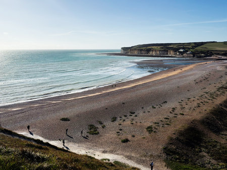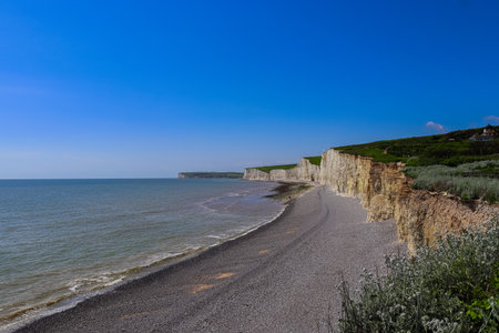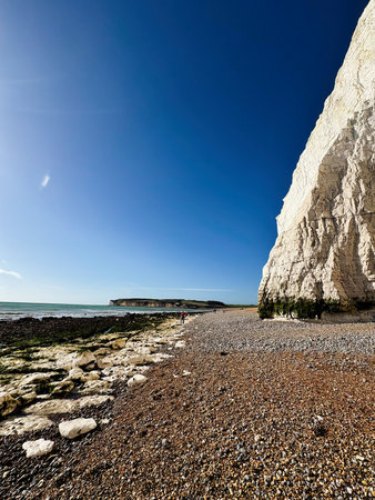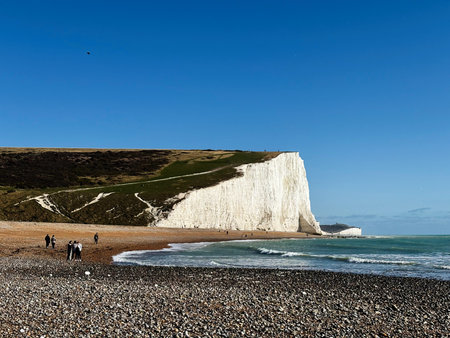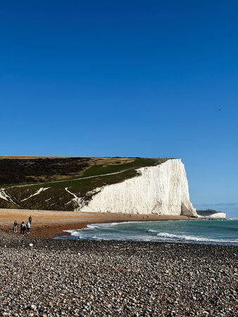 Sunny coastal view of cliffs and pebbled beach at Seven Sisters Cliffs, East Sussex; people enjoy the shore.