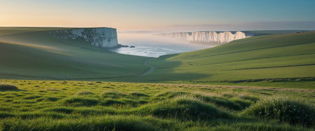 AI Generated. Scenic Landscape with rolling hills and chalk cliffs at golden hour with clear sky