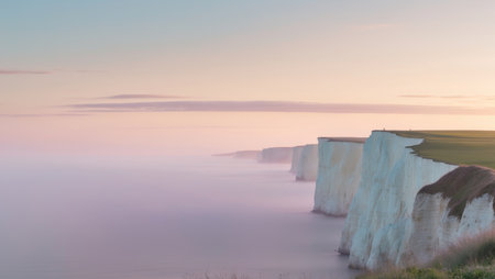 Dramatic white cliffs at dawn a misty atmosphere with serene pink and blue hues