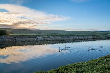 Swans swimming in the Cuckmere River in Sussex, early on a sunny morning