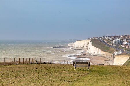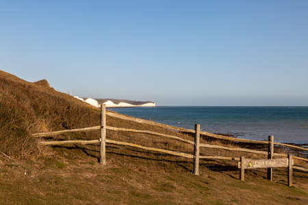Seaford, East Sussex | UK - 2021.04.04: Seaford Head Nature Reserve View on cloudy morning from the top of the Chalk Cliffs walk. Seven Sisters, South of England