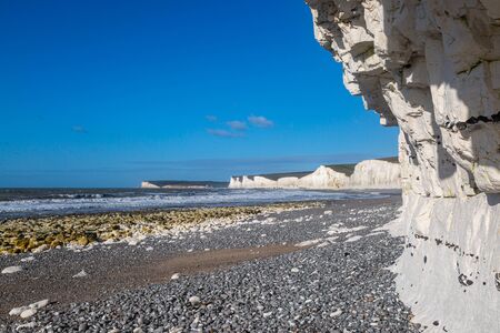 Seven Sisters chalk cliffs rising from the pebble beach and the sea on a clear day, showcasing the dramatic coastline of East Sussex. East Sussex, England