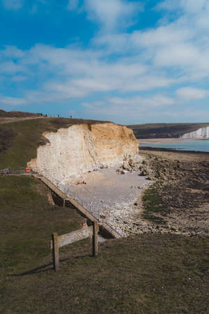 East Sussex | UK - 2021.04.04: People walking the paths of the Seven Sisters, Clifftop Paths Nature Reserve View of the Chalk Cliffs and the English Channel sea from the edge. South of England
