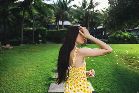 Young woman walks in a yellow dress on a tropical grove with green grass on a sunny day. background. High quality photo
