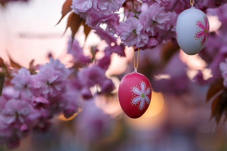 Pastel Easter eggs nestled amongst delicate cherry blossoms. A springtime scene filled with beauty and joy.