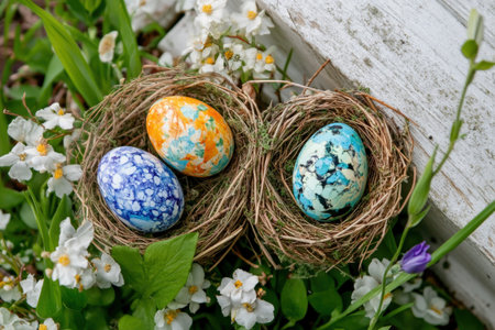 Colorful pastel Easter eggs nestled in a bird's nest, symbolizing springtime and new beginnings.