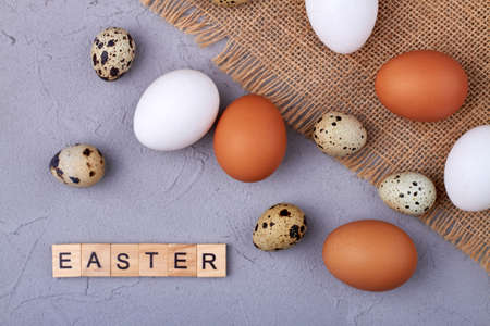 Composition with painted eggs and word Easter on color background
