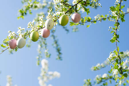 Several Easter colored eggs hanging on a tree branch color sunny spring day. Easter