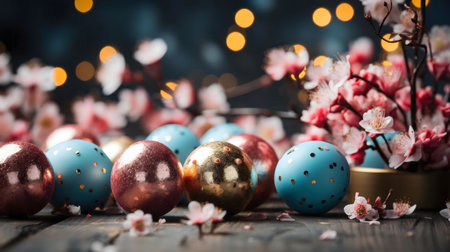 Pastel Easter eggs decorated with gold and pink accents, surrounded by delicate cherry blossoms. A festive and beautiful spring scene.