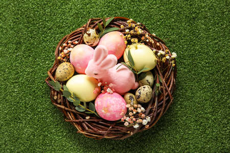 Nest with painted Easter eggs, bunny and flowers on green background