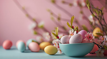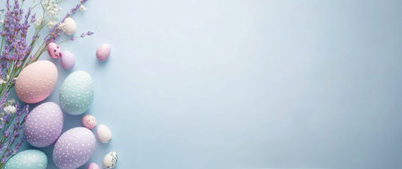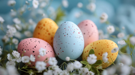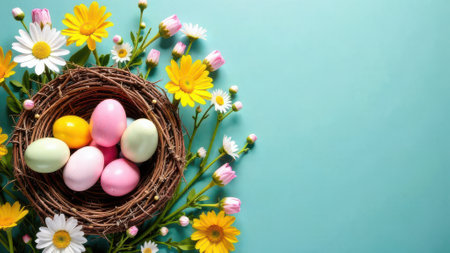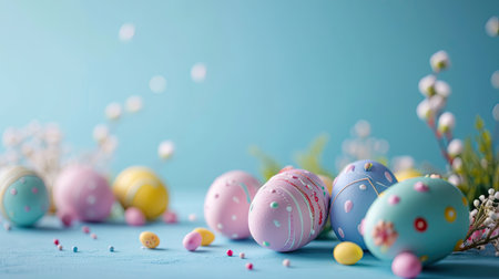 Brightly colored easter eggs in pink and blue rest on a soft blue background surrounded by delicate flowers. This arrangement brings a cheerful spring feeling, ideal for celebrations.