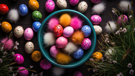 Embrace spring with a pastel Easter basket brimming with joy Colorful eggs nestle among delicate foliage, radiating warmth and renewal Perfect for Easter celebrations, this vibrant scene is a visual delight, capturing the essence of the season Discover the joy it brings AI Generative