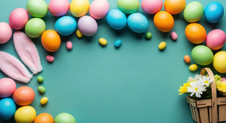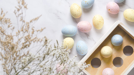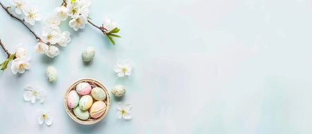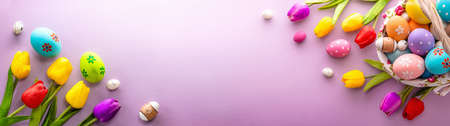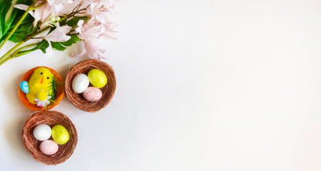 Banner for easter card. Flat lay composition with Easter eggs on white background. Top view