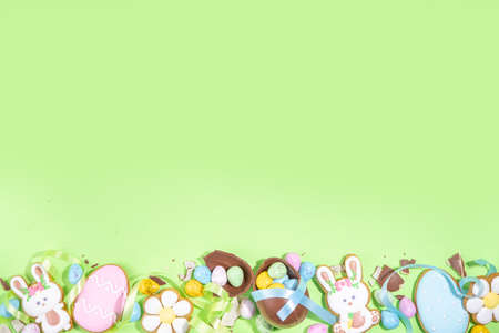 Happy Easter colorful flatlay. Colorful sugared and chocolate Easter eggs, sugar glazed cookies with festive holiday ribbon on light green background top view copy space