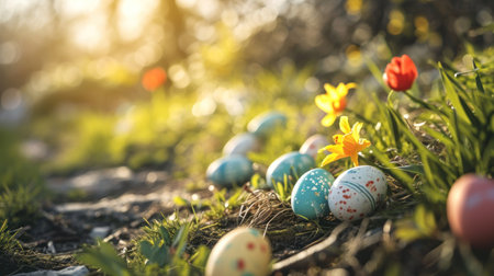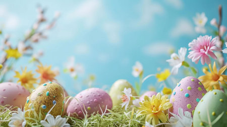 Pastel Easter eggs surrounded by spring flowers. A cheerful scene!
