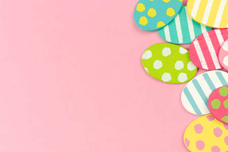 Painted eggs in pastel colors on a pink paper filler and background. Modern easter holiday template.