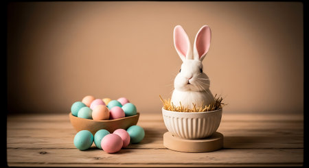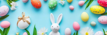 Colorful Easter eggs surround a charming bunny figurine, celebrating the joy of the holiday.,