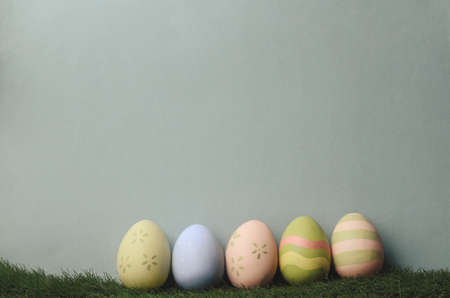 A row of decorated eggs in different colours on artificial grass against blue grey background for Easter. Filtered to give muted, retro style.