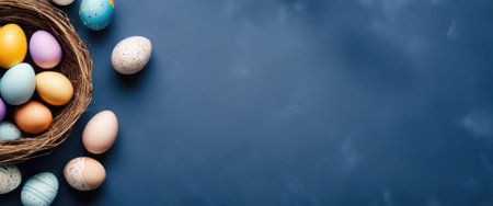Quail Easter eggs on blue background. Flat lay, top view. Easter concept banner.