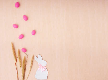 Easter bunny. Happy Easter holiday background concept.Flat lay colorful bunny egg with accessory to celebration on modern rustic pink pastel paper at home office desk.