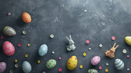 Colorful Easter eggs and other objects on a trendy black background for various Easter themed backgrounds