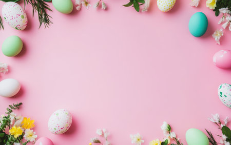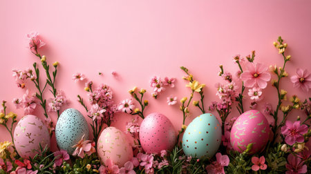 Delicate pastel Easter eggs with floral designs surrounded by fresh spring flowers on a soft pink background, perfect for the season.