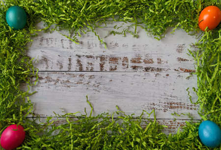 Easter grass with 4 colorful easter eggs in each corner frame, with copy space