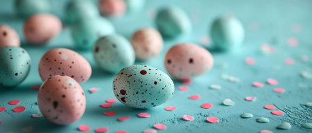 Close up of pastel-colored Easter eggs scattered on a teal surface with pink confetti.