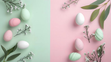 Pastel-colored Easter eggs and delicate flowers arranged on a split mint and pink background. A festive and spring-themed image.