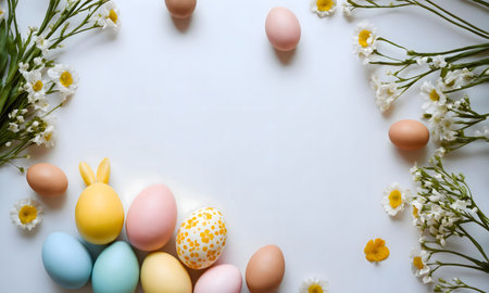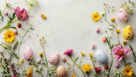 In the image, there are Easter eggs and flowers set against a white background, leaving space for textual content