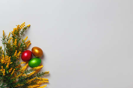 Top view of easter eggs and flower sprigs on gray background. Flat lay with place for text and copy space