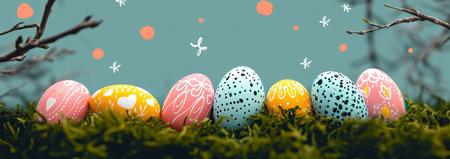 Colorful painted Easter Eggs with various patterns on blue teal Background. Banner with copy space. Ideal for Easter promotions, spring events, holiday greetings, advertisements, festive content.