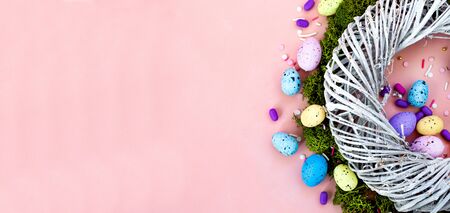 Top view shot of arrangement decoration Happy Easter holiday background concept. Flat lay wreath of twigs and colorful bunny eggs on beautiful pink desk.