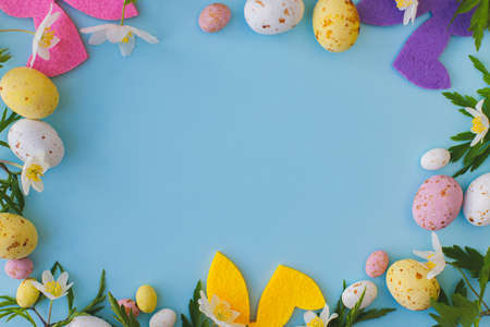 Colorful Easter bunnies, chocolate eggs and spring flowers frame on blue background, flat lay with space for text. Happy Easter! Pink and yellow artificial decor and fresh flowers. Easter hunt