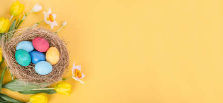 Easter card background baner, colorful Easter eggs with a bouquet of yellow tulips and daffodils on a yellow background, with copy space