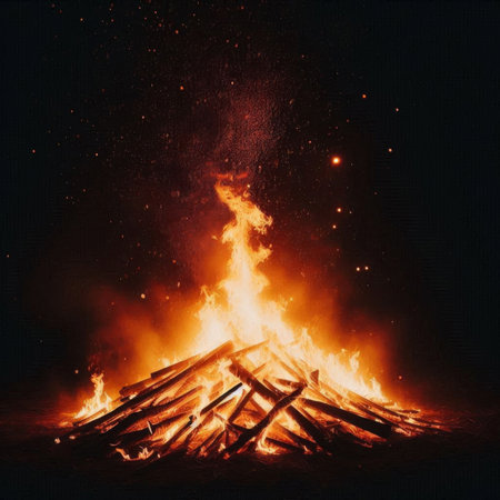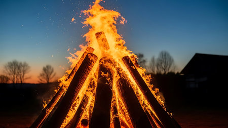 A striking display of fire emanating from a pile of wood logs. Bright flames and flying sparks create an energetic atmosphere, perfect for inspiring warmth and adventure.
